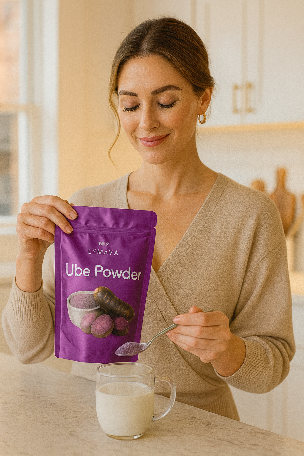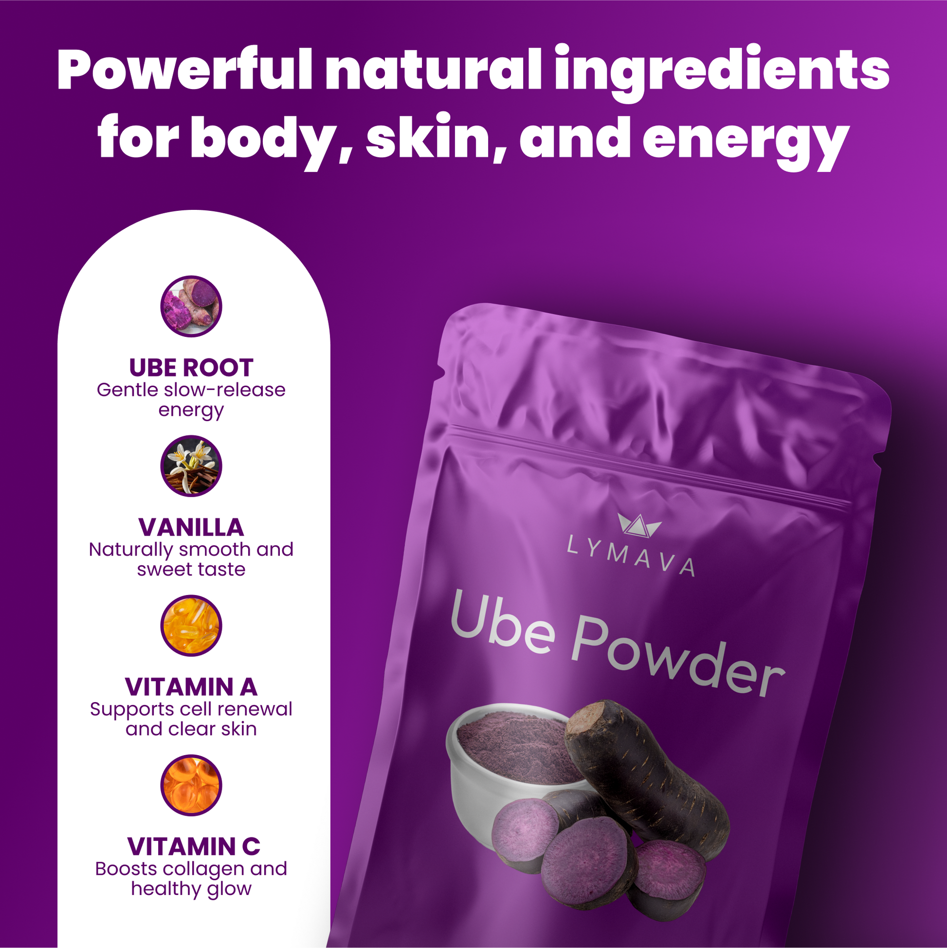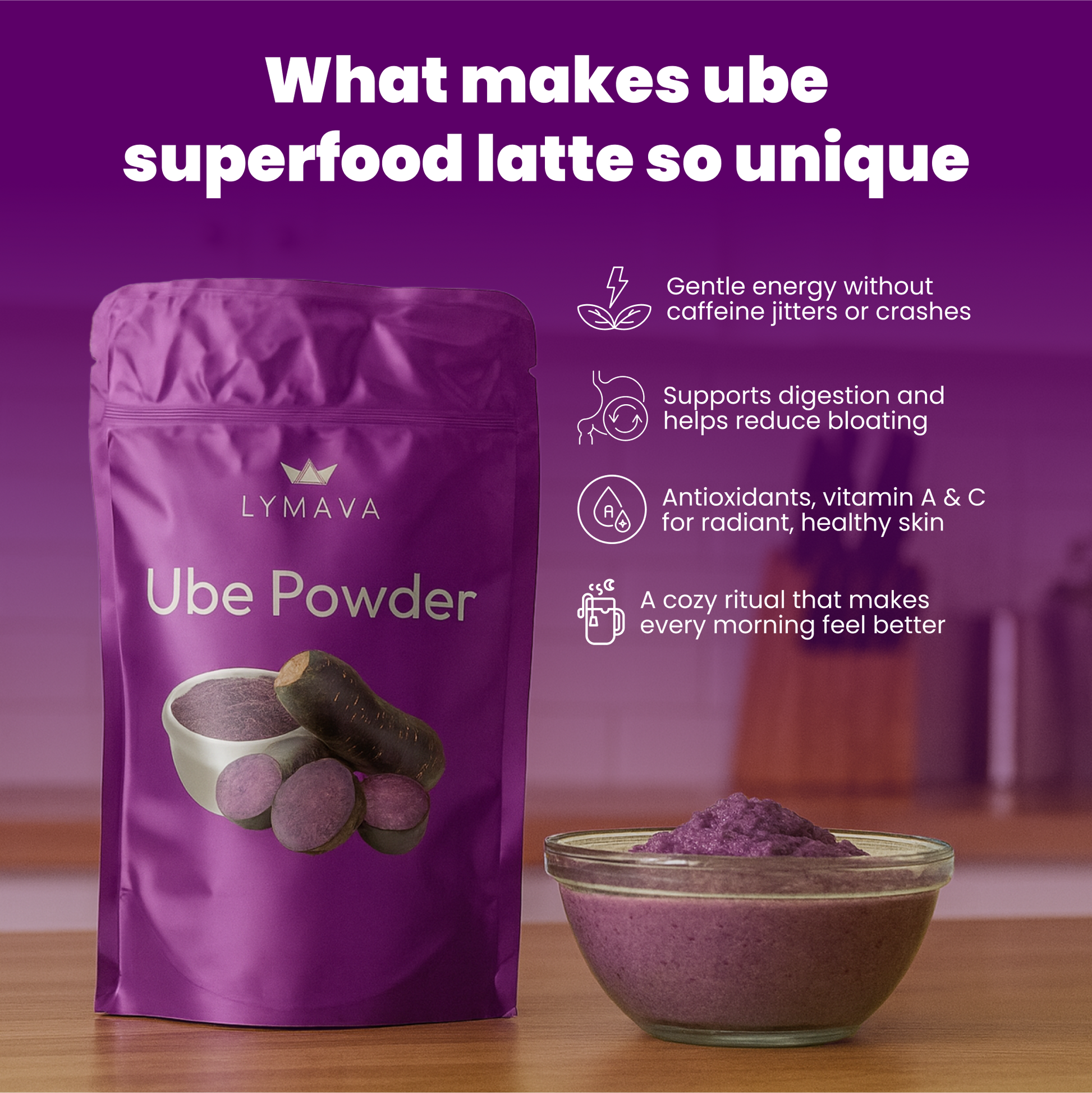 Meet Lymava Natural Ube Powder, made from a vibrant violet root from the Philippines that has been cherished for centuries. With just one spoon and your favorite milk you create a creamy purple latte that tastes like smooth vanilla with a hint of nuttiness. There is no caffeine, no bitterness and no crash, instead you get calm steady energy from natural slow release carbs. Packed with antioxidants and vitamins A & C, it helps reduce bloating, supports healthy digestion, and gives your skin a natural glow from the inside out. This is not just a drink, it is a morning ritual that feels like self-care.
